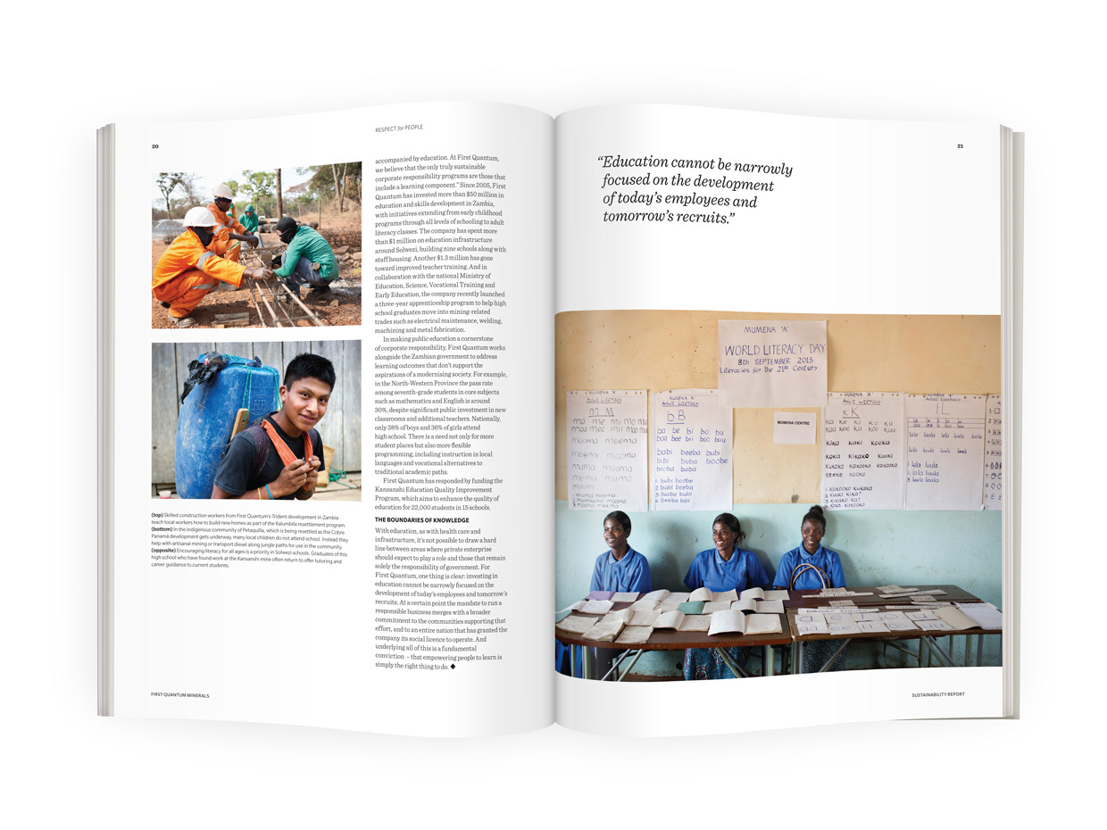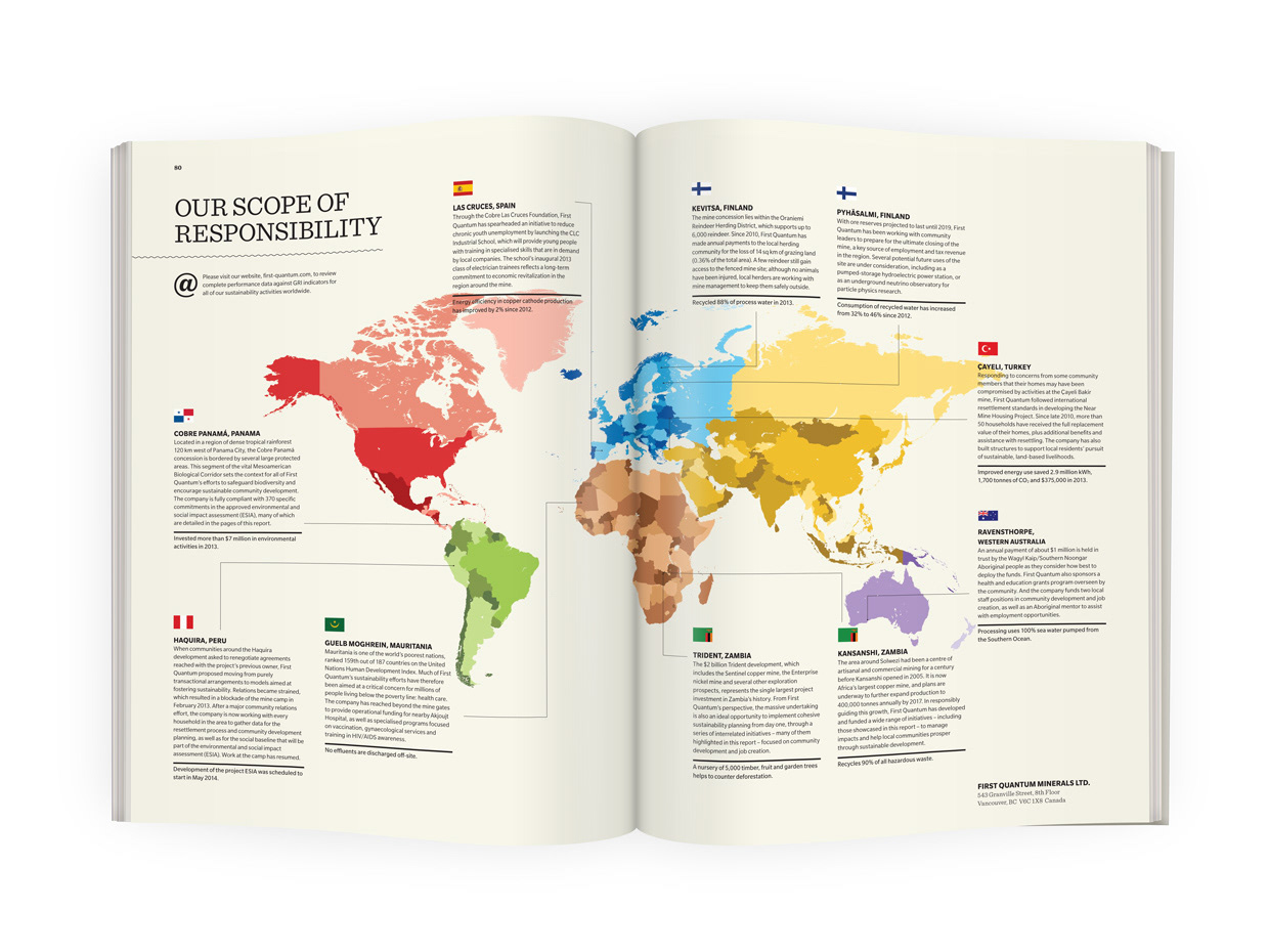 This 82 page sustainability report showcases this mining company's initiatives in Panama and Zambia with a focus on infrastructure, education, the environment and community building.